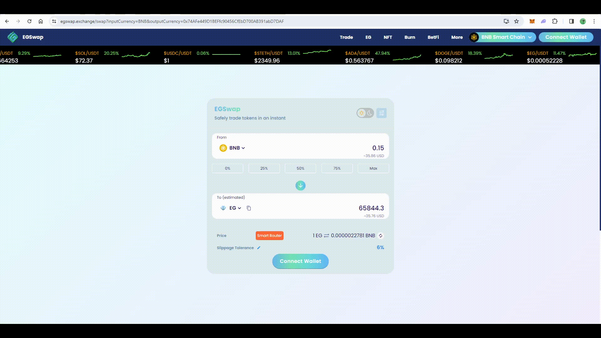 Let's say that the BNB/Bake pair does not exist on EGSwap. The EG SmartRouter will then search the entire market to get you the best available prices. If you go ahead with the trade, we will use a part of the fees/commission collected to burn the Bake token by hosting a burn party, thus reducing its supply.