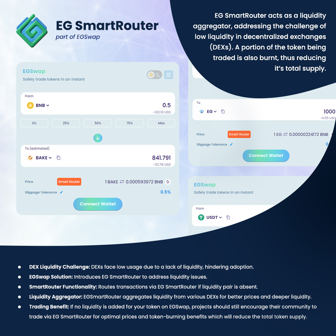 The EGSmartRouter acts as a liquidity aggregator, sourcing liquidity from multiple sources, including various DEXs. This will help users find better prices and access deeper liquidity across different platforms.&#x20;