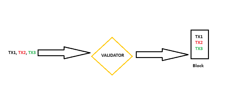 A validator gets to decide unilaterally how these transactions are ordered. It may have seen these transactions in order like we've seen here, but it's not obligated to retain that order. It can even insert its own transactions in the block.