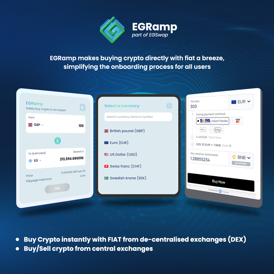 Simplifying the entry for traditional investors and newcomers to the cryptocurrency world. This will allow users to buy crypto directly with FIAT. Partners who list their projects on EGSwap will be able to onboard their tokens to the EGSwap Fiat On-Ramp solution so that their users can buy the token directly via Fiat.