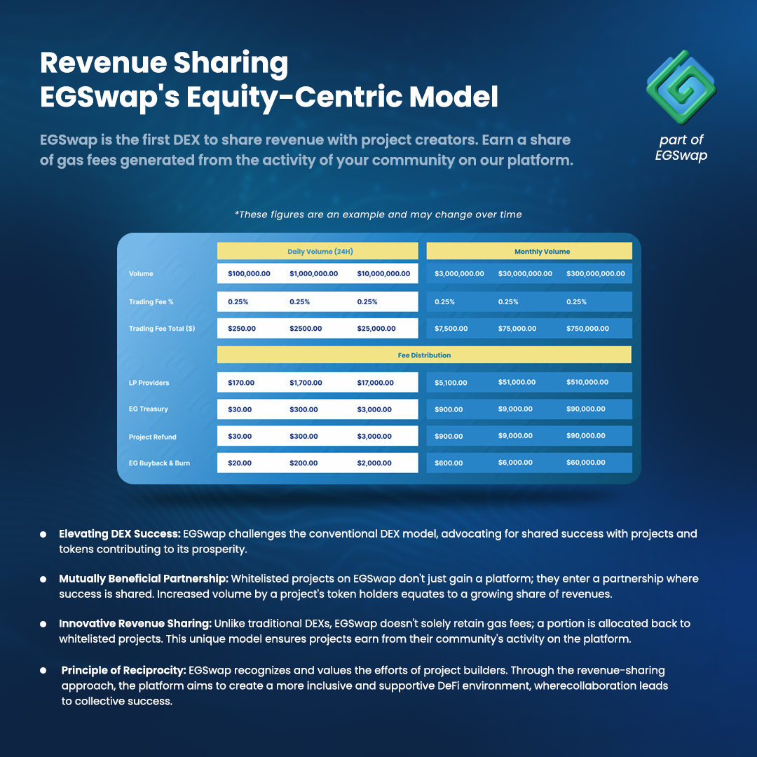 However, EGSwap's ethos is fundamentally different. We believe that the success of a DEX shouldn't be solely to its own benefit; the projects and tokens that contribute to this success should also share in the rewards. To that end, EGSwap has pioneered a revenue-sharing model designed with equity in mind.